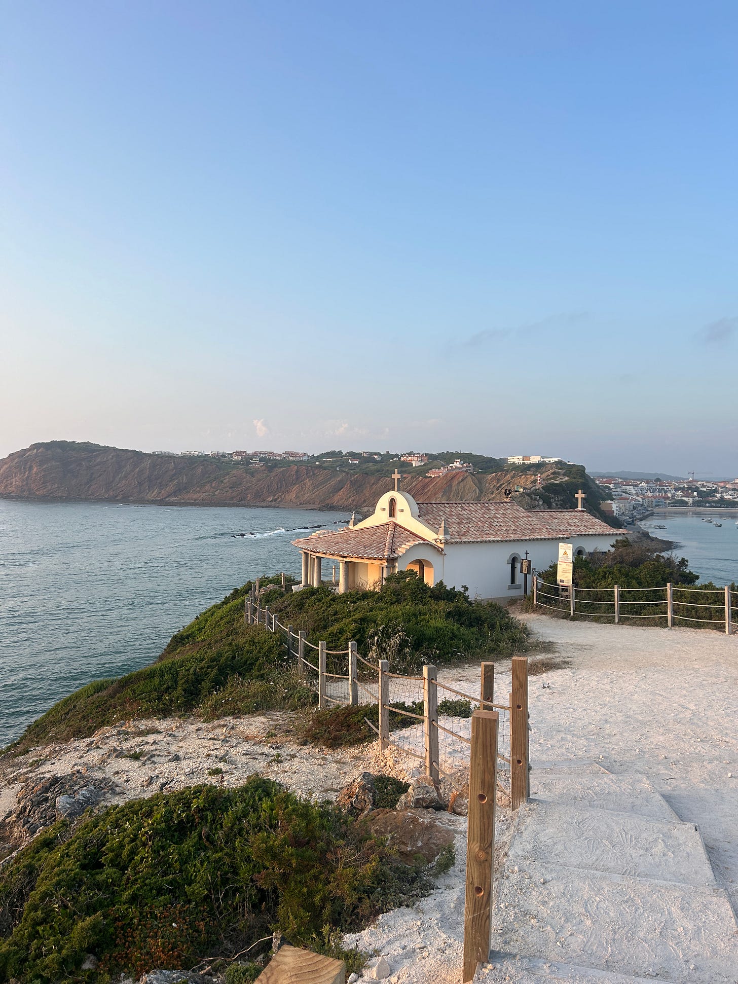 This simple, ancient chapel hangs over the edge of a cliff between the Atlantic and the Bay of São Martinho.